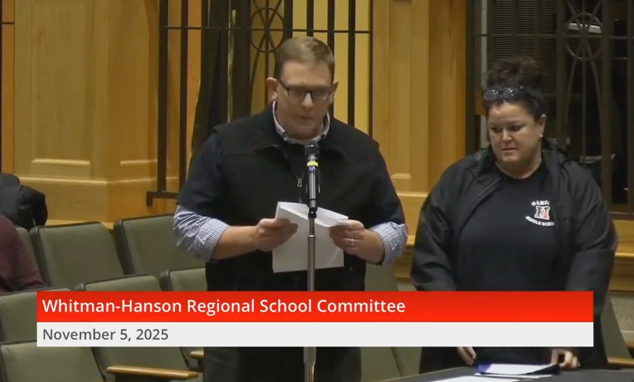 HANSON - November 5 - The Whitman-Hanson Regional School District confronts a $1.43 million budget crisis requiring layoffs of up to 30 employees just weeks before the holidays. At a tense three-hour emergency meeting November 5, the teachers union delivered votes of no confidence in Superintendent Jeff Szymaniak and Assistant Superintendent George Ferro as school committee members discovered they lack legal authority to direct the Superintendent on personnel cuts—and that every week of delay makes the problem worse.
