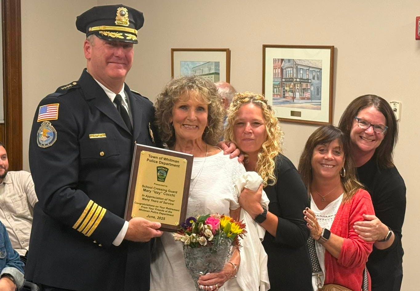 The board recognized retiring crossing guard Mary "Izzy" Cocchi, who served 11 years protecting schoolchildren at the busy Route 18 and Route 27 intersection. Chief Hanlon praised her dedication, noting she had called in a car crash earlier that day despite being retired.